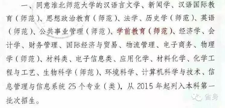 2015年,汉语言文学、新闻学、汉语国际教育(师范)、思想政治教育(师范)、法学、历史学(师范)、英语(师范)、公共事业管理(师范)、学前教育(师范)、经济学、会计学、财务管理、国际经济与贸易、物流管理、电子商务、物理学(师范)、材料类、电子信息类、应用化学、材料化学、化学工程与工艺、生物科学(师范)、环境科学、计算机科学与技术、信息管理与信息系统25个专业(类)开始列入本科第一批次招生。
